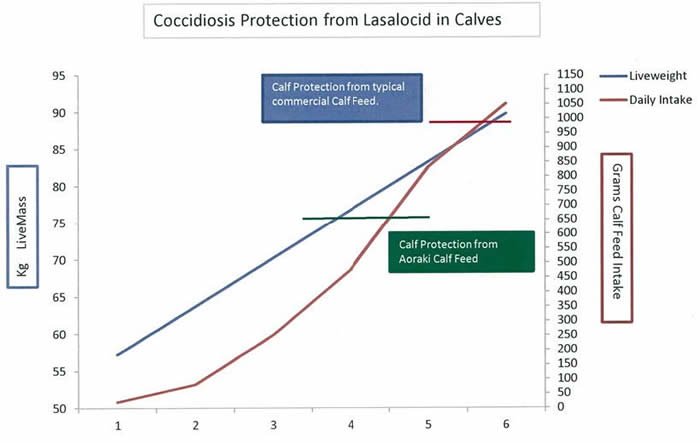 You can see from this graph that as Aoraki Calf Meal has Bovatec® included at higher inclusion rates, protection is gained earlier. However, note the calf could be 5 weeks old before it gains sufficient protection. If it is has ingested oocysts during the period of non-protection and then suffers from one of the triggers already listed, then there is a high risk of coccidiosis occurring.