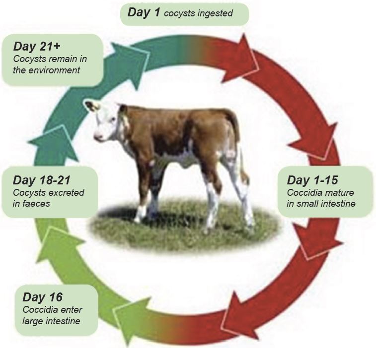 Coccidiosis is a protozoan disease and all cows carry coccidial oocysts in the small and large intestines. Most cattle develop some immunity to it while continuing to shed a few oocysts in their faeces. Introducing new animals to the herd can introduce new variants of coccidial oocysts to which there is limited herd